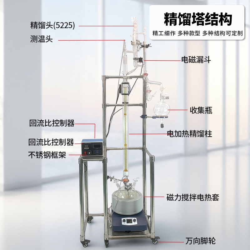 • 参数监控:通过 PT100 温度传感器实时观察塔内温度梯度,医药领域提纯原料药时,保持塔顶温度稳定,避免波动影响产物纯度;运行中借助玻璃透光性观察气液流动状态,若出现异常积液,及时调节回流比(控制精度 ±2%),防止塔板或填料堵塞。